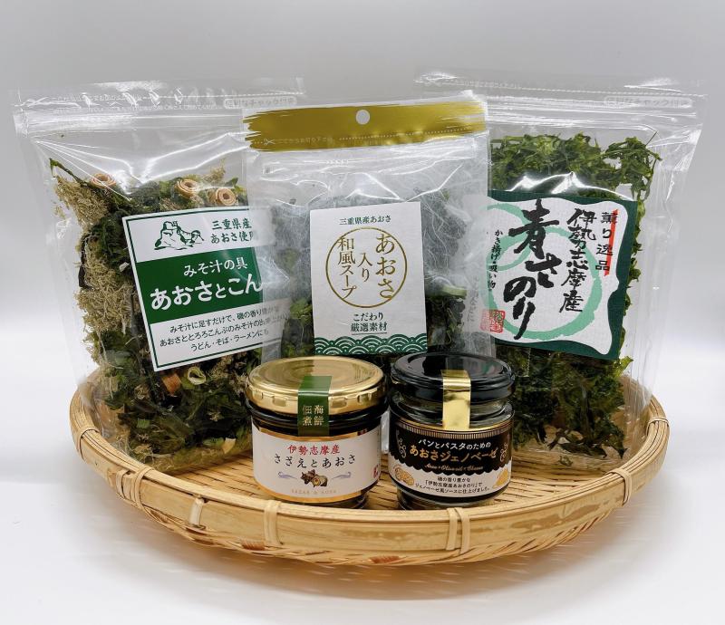 磯の香り豊かな三重県産の青さのりを使用した商品のセットです。「青さのり」をはじめ、とろろ昆布と青さのりのトロリとした舌触りが楽しいみそ汁の具「あおさとこんぶ」、お湯を注ぐだけの簡単調理「国産あおさ入り和風スープ」、ご飯のお供に三重県産のさざえも入った佃煮「さざえとあおさ」、パンとパスタに合うジェノベーゼ風ソース「あおさジェノベーゼ」を詰め合わせセットにしました。すぐに使えて便利なので、贈り物に最適です。