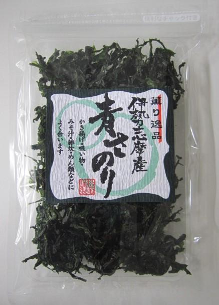 磯の香り豊かな伊勢志摩産の青さのりは,水のきれいな多くの川が流れ込む伊勢湾の栄養たっぷりの漁場で育てているので、色・香りはもちろん味も最高です。また、全国生産の70%強を占めており、人気のある階層商品です。火を通しても調理しても香りが残っているので、お味噌汁だけでなく、卵焼きやかき揚げに混ぜたり、また、レンジにかけ細かくして、料理に振りかけても、磯の香りを楽めたりといろんなお料理に合います。