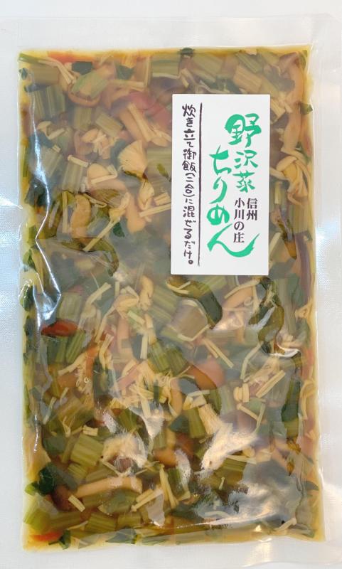 炊いたごはんに混ぜるだけの混ぜごはんの素です。野沢菜ちりめん、しょうがご膳、山菜きのこちらし、など種類も豊富に取り扱っております。市販の物に比べ塩度を抑えているため家庭的な味に仕上がっていてとてもお召し上がりやすい一品です。保存料、着色料を使用しておりません。