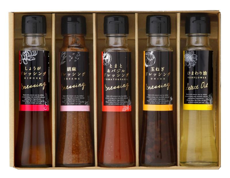 野菜がたっぷり食べれるドレッシングセットです。小豆島の醤油をベースに生姜を効かせた和風の「しょうがドレッシング」。サラッとした口あたりの「胡麻ドレッシング」。国産トマトの風味に爽やかな香りの小豆島産バジルを合わせた「とまと&バジルドレッシング」。粗めに刻んだ淡路島産の玉ねぎと、国産丸大豆醤油を使用した「玉ねぎドレッシング」。健康や美容を意識した人にはうれしい「ひまわり油」を詰合せ。