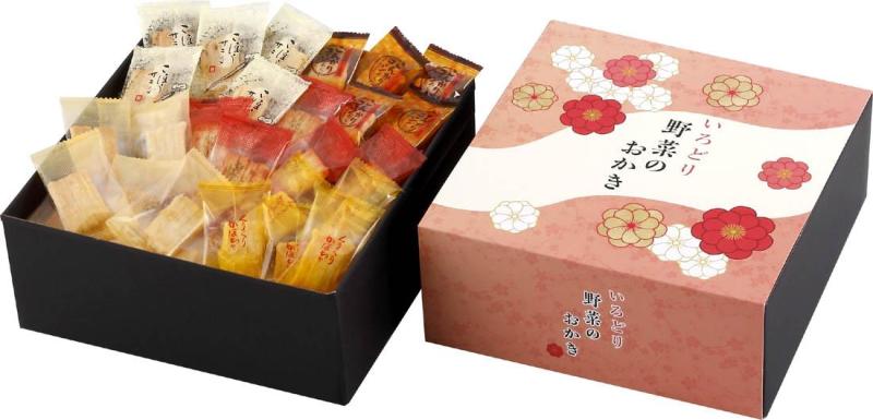 国産もち米を使用した野菜入りのおかきセットです。とまと、じゃがいも、ごぼう、とうもろこし、かぼちゃの6種類を詰合せました。