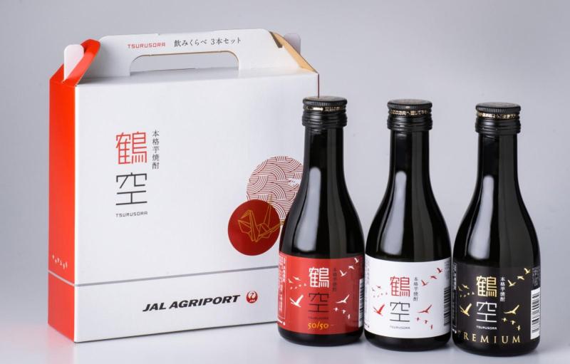 千葉県産の紅あずま、紅はるか2種類を50%ずつブレンドをして製造しました。芳醇な香りと、泡盛のような味わいの芋焼酎です。鶴空(25度)、鶴空50/50(30度)、鶴空PREMIUM(35度)を180mlボトルにした3本セットです。アルコール度数、原酒配合比率の違いをお楽しみいただけます。鶴空PREMIUMは、JAL国際線機内販売商品のため、一般流通していない商品となります。