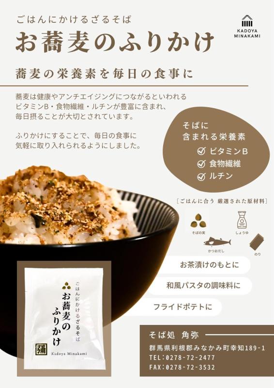 「ごはんにかけるざるそば」として、そばを手軽に楽しんでいただくためにつくりました。 蕎麦は栄養豊富で健康食としても注目の高い食品です。毎日でも食べたい蕎麦の栄養素を手軽に食事に取り入れられるようにふりかけにしました。 香ばしい蕎麦の香りとのりやかつおの香りを楽しめます。お子様にも大人気! ふりかけブームの現在、ぜひお試しください。