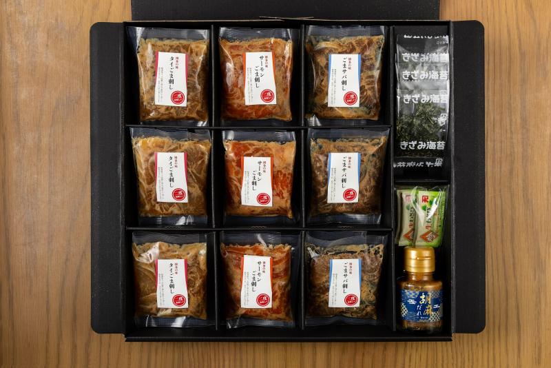 九州の郷土料理 『ゴマ刺身』をギフトパックにしました。 魚種は サバ、サーモン、タイの3種類×3パックの合計9パックにゴマだれ付き 50gの個包装で食べ切りサイズでお好みで、先ずはごまさし単体で召し上がり 海鮮丼にしたり、最後はごまさし茶漬けにしたりと『ひつまぶしスタイル』で食べて頂くと尚美味しく召し上がれます。 冷凍からでも流水で3〜5分程で溶けて、手軽に博多の味を家庭で再現できます。