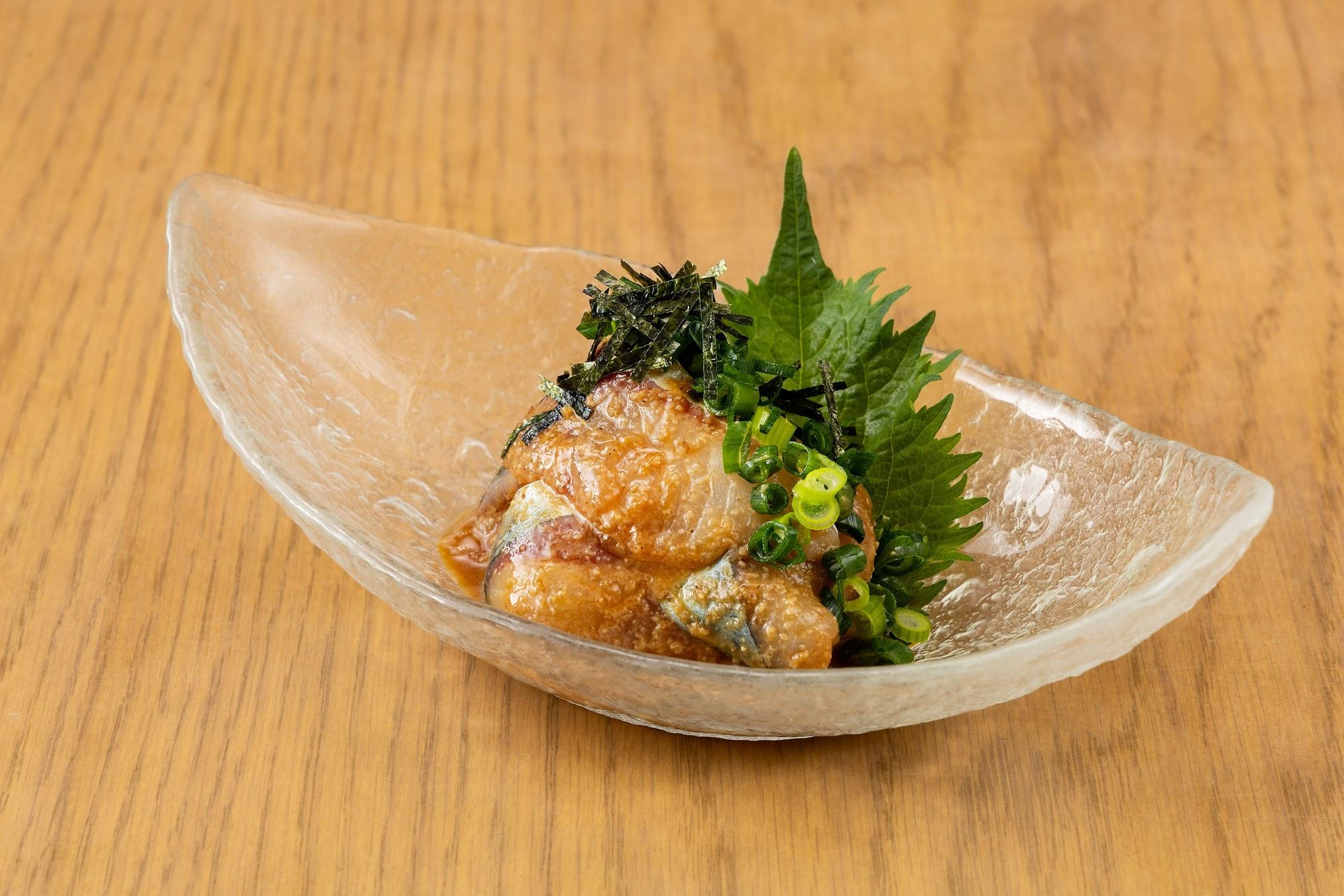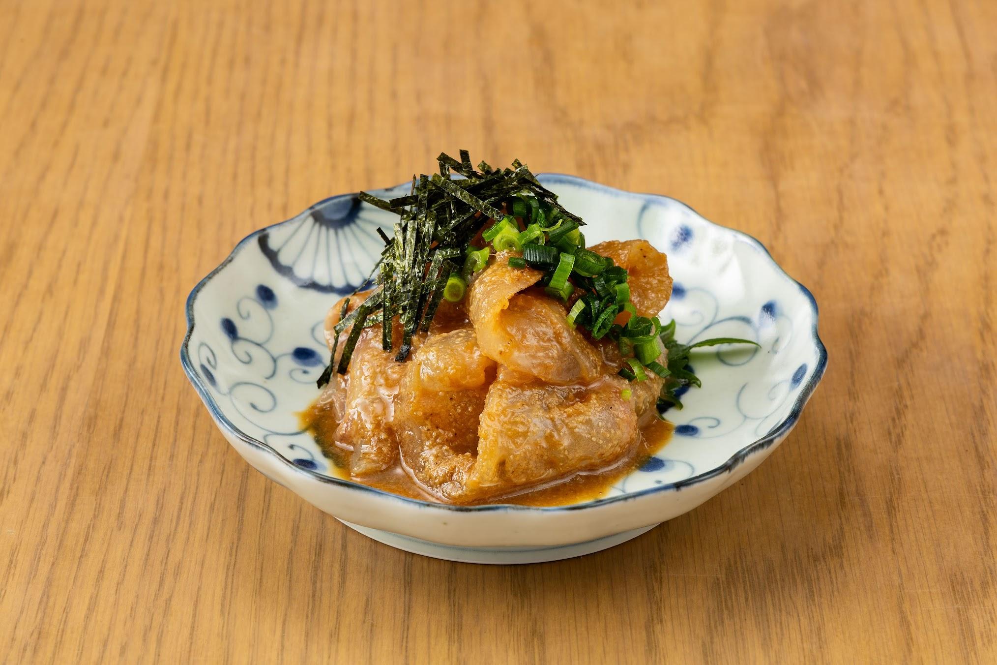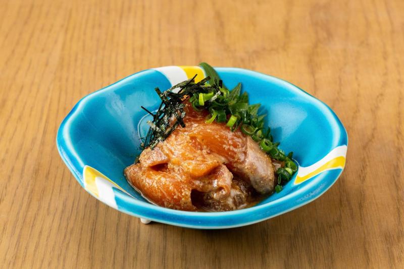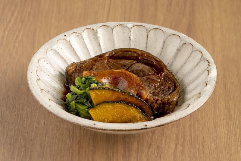 福岡県の長浜市場で水揚げされた、本マグロの市場ではほとんど見ることのない 希少価値の高い尻尾を断面にカットし真空調理で贅沢なマグロの煮付けとして仕上げました。コラーゲンもたっぷりと含まれており旨みが凝縮しておりパサつきなどは無はありません。